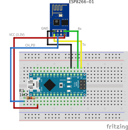 Esp8266 arduino nano wiring. So we will use the esp8266 01 wifi module to add the wifi feature to our tiny arduino board. The esp8266 is a 33v device and so i am using a voltage divider to bring the arduinos 5v down to 33v. Now connect everything according to the scheme.